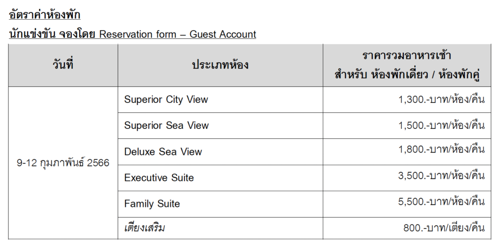 นักกีฬาสามารถจองผ่านแบบฟอร์มของโรงแรมได้โดยตรง สามารถดาวน์โหลดได้ที่นี่ “ดาวน์โหลดแบบฟอร์มจองห้องพัก”